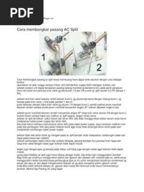Cara Pemasangan Ac Split from imgv2-1-f.scribdassets.com Bongkar unit outdor dengan cara lepaskan naple pipa besar dan kecil dengan kunci kombinasi lepas kabel power dari unit outdor kemudian turunkan apabila unit outdor ada diatas kumpulkan perlengkapan ac menjadi satu biar tidak tercecer dan hilang. Apakah anda bisa membongkar ac? Cara bongkar unit indoor ac. Untuk ac yang berukuran 1.5 sampai 2 pk maka harga untuk bongkar pasang ac ialah: Setelah outdoor unit dapat beroperasi pasang selang manifold yg berwarna biru pada pentil pengisian freon lalu buka mur penutup kran valve yg berukuran 1/4 dan 3/8 (untuk… More images for cara bongkar pasang ac » Cara membongkar pasang ac split tanpa membuang freon dapat anda lakukan dengan cara sebagai berikut: Namun, akan lain ceritanya bagi orang awam yang minim pengetahuannya tentang mesin pengkondisi udara yang satu ini.